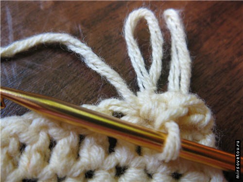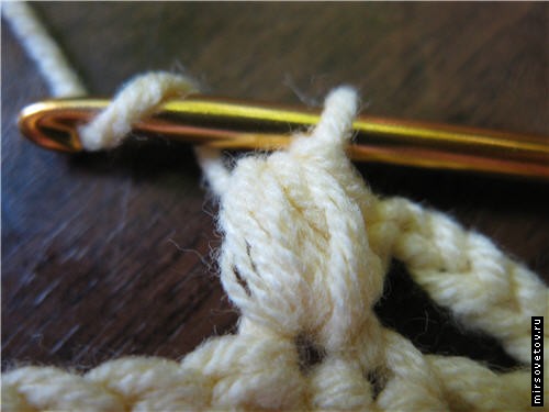 - шишечка. Несколько сс2н (или больше накидов) провязывают из одной петли основания, не заканчивая в каждом из них последнюю протяжку. Таким образом, на крючке столько петель, сколько столбиков. Накид и протянуть через все петли на крючке;