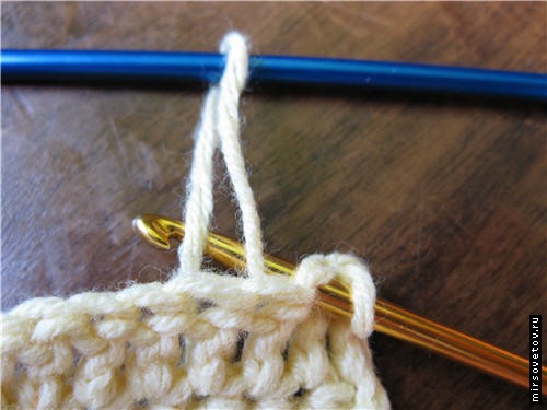 - вытянутые петли «брумстик» (ВПБ или впб). Вязание слева направо, в каждый последующий сбн основания вводится крючок, вытягивается петля нужной длины и одевается на спицу, и так сколько нужно. А следующий ряд можно вязать любой;