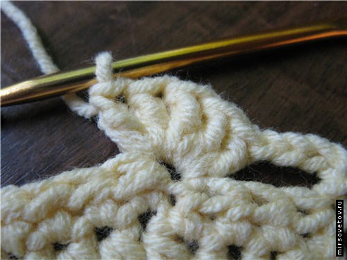 2 накида, завести крючок в ближайший сбн основания, вытянуть петлю, накид, протянуть через 2 петли на крючке, накид, протянуть через 2 петли на крючке, накид, протянуть через 2 петли на крючке;