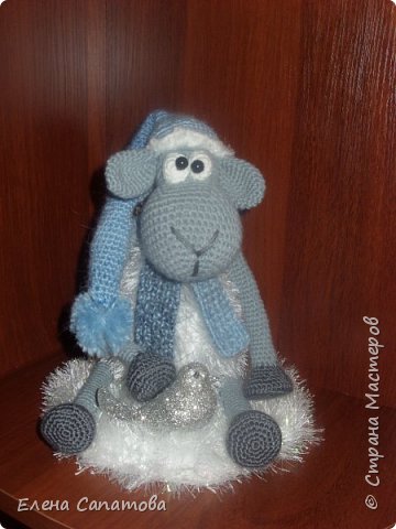 Я вязала метализированной травкой белого цвета, очень красиво смотрится, переливается как снег, но очень тяжело вязать. Вы можете взять обычную травку белого цвета, из которой вязали туловище.