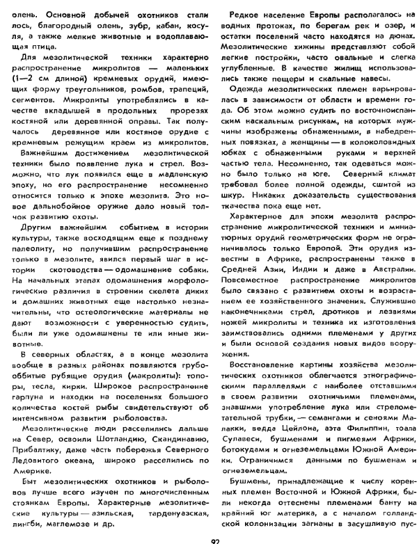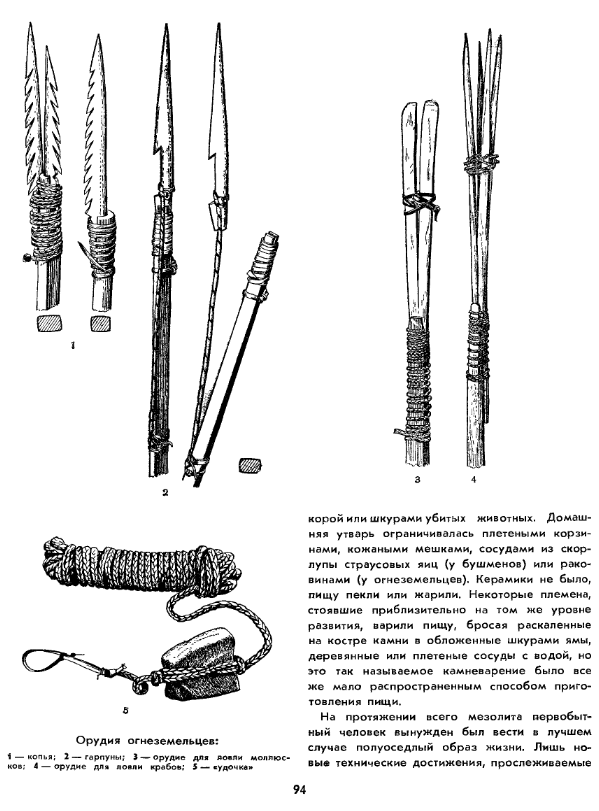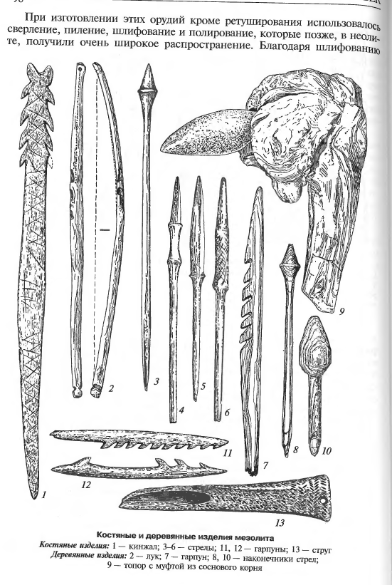 В палеолите это было копье, бросаемое с помощью копьеметалки, в мезолите оно дополняется еще более действенными луком и стрелами. В результате роль охоты, производимой небольшими группами людей, возрастает.