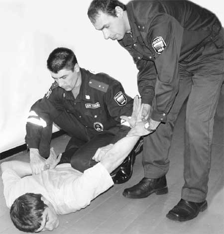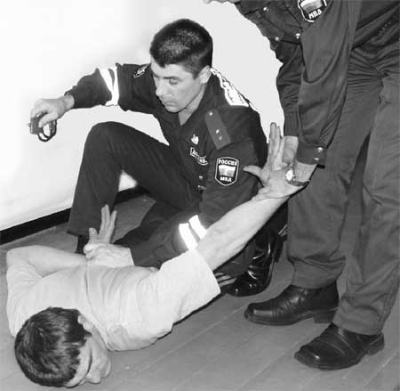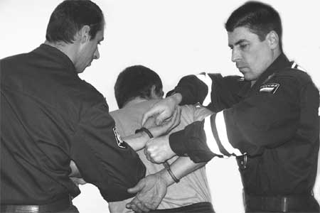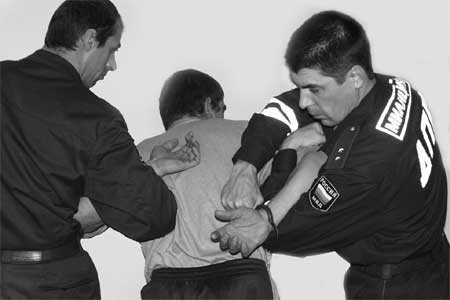 Рассмотрим варианты задержания и надевания наручников двумя сотрудниками милиции с переводом противника в положение лежа и в положении стоя.