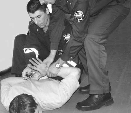 Представленный вариант надевания наручников является наиболее оптимальным. Противник надежно блокируется. Заведение замковых устройств за запястье сектором вверх обеспечивает свободное вращение сектора наружу, исключающее зацепление его за одежду.