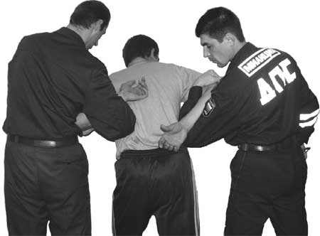 № 1 помогает завести левую руку за спину, а № 2 надевает наручники на левую руку.