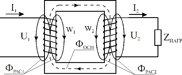 Рассмотрим принцип действия простейшего силового трансформатора. Силовым называется трансформатор потому, что он питает нагрузку, выполняющую работу посредством электрической или электромагнитной силы. Под действием напряжения, подведенного к первичной обмотке W1, по ней протекает первичный переменный ток I1 , который создает переменный магнитный поток ФОСН. Магнитный поток ФОСН, замыкаясь по магнитопроводу, наводит во вторичной обмотке переменную ЭДС взаимоиндукции Е2. При подключении нагрузки (сопротивления) ZНАГР ко вторичной обмотке под действием Е2 через обмотку и нагрузку протекает вторичный ток I2.(рис.4.1)