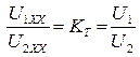 Ввиду того, что вторичная обмотка имеет также сопротивление, то при протекании вторичного тока на вторичной обмотке устанавливается напряжение U2, несколько меньше, чем Е2 . На холостом ходу U2XX = E2. Отношение первичного напряжения ко вторичному на холостом ходу называется коэффициентом трансформации силового трансформатора.