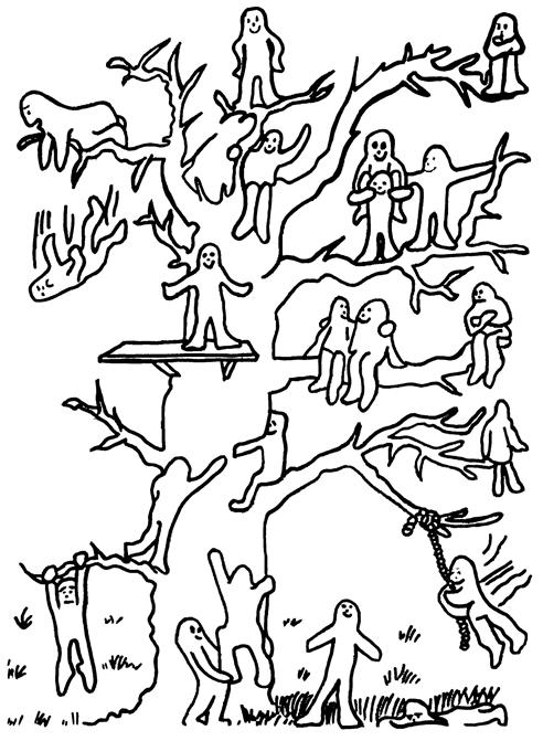 Допустим, что это дерево символически обозначает отношения между героями произ-ведения. Найди и отметь себя на этом рисунке, а также вырази свое отношение к героям, подписав их имена рядом с соответствующим человечком.