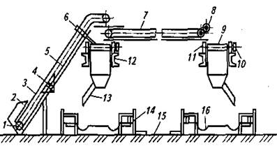 Поперечный транспортер 7 имеет привод 8 и располагается над транспортерами-раздатчиками.