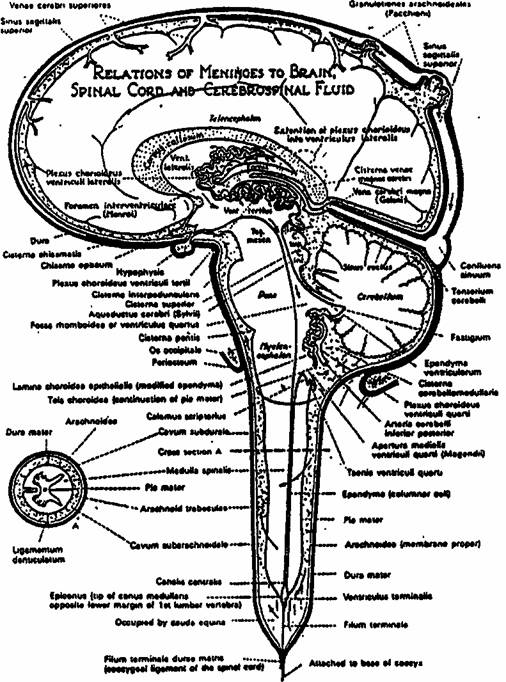 Рис.35. — Средний сагитальный срез головного и спинного мозга, показывающий подпаутинное пространство, цистерны и желудочки, и взаимосвязь с нервной тканью. Стрелки показывают направление тока спинномозговой жидкости (из монографии А.Т.Фасмуссена). («Основные нервные пути»), 4-е издание! 1952 г., компания Махмиллан.