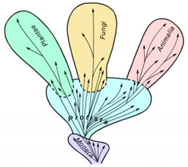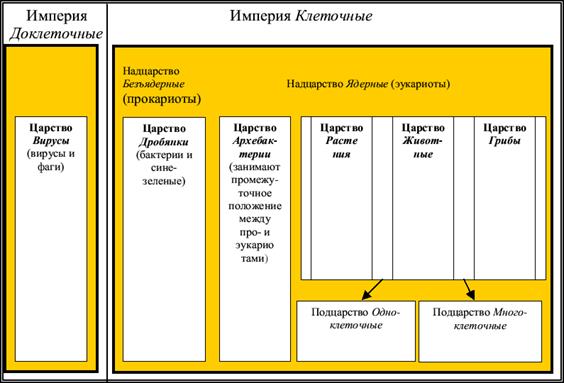 В 1969 году Робертом Уиттекером была предложена система пяти царств, завоёвывающая сейчас всё больше и больше сторонников. Прокариоты у него по-прежнему объединены в одно царство Monera. Примитивные эукариоты, не имеющие тканевой дифференциации (простейшие, водоросли, слизевики), объединены в царство Protista. Всё, что осталось от растений, (мхи, папоротники и семенные растения) составило царство Plantae, все высшие классы грибов – царство Fungi, все многоклеточные животные – царство Animalia.