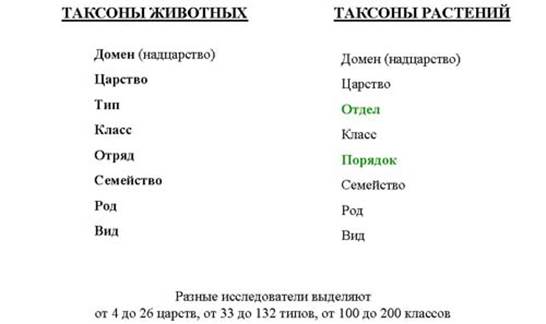 Классификационная система подразделяется на соподчиненные друг другу систематические категории, или единицы, — таксоны. Различают таксоны нескольких уровней. В настоящее время высшим таксоном считается Империя организмов, а элементарным таксоном — вид. Основная таксономическая категория, используемая в биологической систематике, — вид. Специфика каждого вида выражена морфологически и служит выражением его генетических особенностей. Близкие виды образуют роды, близкие роды — семейства, семейства — порядки, порядки — классы, классы — отделы, и, наконец, отделы образуют царства органического мира. Каждое растение принадлежит к ряду последовательно соподчиненных таксонов. Это иерархическая система классификации.