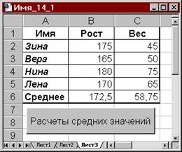 4.2. Создайте таблицу, приведенную на рис.14.8. Для этой таблицы создайте макрос с именем "Расчеты", который будет вычислять средние значения роста и веса, записывая их в соответствующие ячейки. Для вызова этого макроса создайте элемент управления типа "командная кнопка", при выборе (нажатии) которой будет выполняться расчет средних значений.