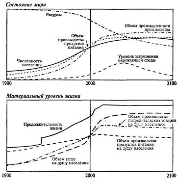 Результаты глобального моделирования. Опубликованные «сценарии» развития человечества, следующие из моделей WORLD, охватывают промежуток времени от 1900 до 2100 гг. Первые 90 лет, уже прошедшие, позволяют «настраивать» модель, понять степень ее достоверности.