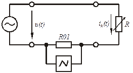 Собрать цепь в виде четырёхполюсника, состоящего из вспомогательного резистора R01 (см. рис. 2.3.1). Ко входным зажимам четырёхполюсника подключить источник переменного напряжения с выставленными в п. 2 параметрами. К выходным зажимам подключить блок переменного сопротивления R. Параллельно резистору R01 подключить осциллограф.