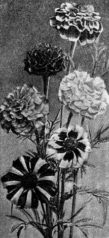 Бархатцы (Tagetes) (рис. 84). Сем. Сложноцветных. Очень невзыскательные растения с перистыми листьями и обильным цветением в течение всего лета. Цветы желтые, оранжевые и темнобурые. Зелень при трении издает своеобразный запах.