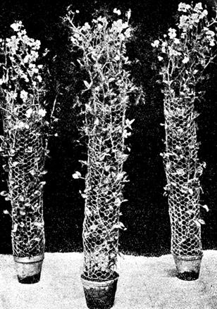 Горошек душистый (Lathyrus odoratus). Сем. Мотыльковых. Очень невзыскательный летник с красивыми, разноколерными цветами, имеет прекрасный запах. Так как горошек является цепляющимся растением, то как только он поднимется, ему необходимо дать опору в виде обыкновенных колышков или проволочную опору разнообразных форм (рис. 91), например, из ряда последовательных кругов, удерживаемых один над другим около центрального кола и т. п. В результате можно получить колонку, пирамидку, шар и другие фигуры, заплетенные четырехгранными стеблями с крупными листьями и красивыми душистыми цветами.