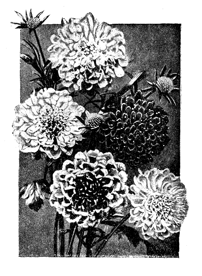 Скабиоза (Scabiosa) (рис. 99). Сем. Ворсянковых. Невзыскательное растение с головчатыми бархатисто-красными соцветиями и других колеров. Цветет с июня до октября. Формы высокие (50—70 см) и низкие (35 см), с цветами махровыми и простыми.