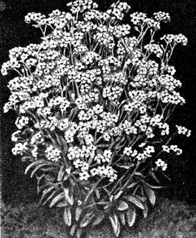 Алиссум (Alyssum). Каменник. Сем. Крестоцветных. Белые пахучие цветы в кистях. Лучший — А. Веnthamii (maritimum) высотой в 25 см. Цветет несколько декад. При возобновлении посевов цветение можно продлить до глубокой осени. При обрезке зацветает вторично. Посев в мае. Идет для групп, рабаток, каменистых участков. Амарантус (Amarantus). Сем. Амарантовых. Растение с сочными, хрупкими стеблями и нежными, ярко окрашенными листьями. Мелкие цветы в пониклых метелках из коротких густых колосьев (A. caudatus) или в метелке из густых, длинных, прямых колосьев (A. sanguineus nanus). Высота первого — 75, второго — 50 см. Известны еще: A. atropur-pureus A. abyssinicus и др. Высевают в парники в конце марта — начале апреля. Идет для одиночных и групповых посадок в больших группах и рабатках. Для большей компактности и кустистости прищипывают верхушки растений. Требователен к теплу.