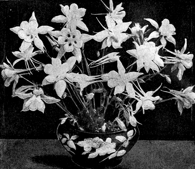 Аквилегия (Aquilegia). Орлик. Водосбор (рис. 106). Сем. Лютиковых. Зимостойкие, выносливые растения, высотой до 80 см. Изящная разрезная темнозеленая листва. Начинает расти еще под снегом и сохраняется до глубокой осени. Благодаря обильному цветению и разнообразию окрасок аквилегия имеет широкое распространение. Цветы с длинными шпорцами, или без них, собраны в разветвленных метелках.