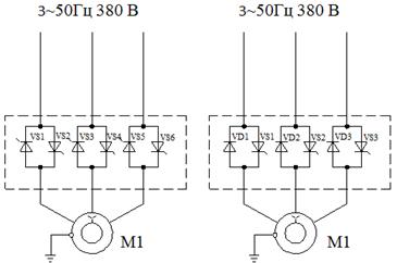 Эти схемы являются аналогами силовой схемы подключения асинхронного двигателя (АД) с помощью магнитного пускателя. Встречно-параллельно включенные тиристоры (тиристор-диод) в каждой фазе являются аналогом силового контакта на замыкание и обеспечивают прохождения тока по нагрузке в течение всего периода питающего напряжения.