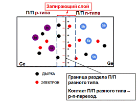 При образовании контакта происходит процесс диффузии: электроны частично переходят из полупроводника n-типа в полупроводник р-типа, а дырки – в обратном направлении. В результате полупроводник n-типа заряжается положительно, а р-типа – отрицательно. Диффузия прекращается после появления запирающего слоя, то есть границы раздела п/п разного типа. В результате диффузии электронов и дырок, с одной стороны скапливаются одни, с другой – другие заряды, эти заряды друг друга уравновешивают, поэтому дальнейшее перемещение электронов и дырок через запирающий слой не происходит.