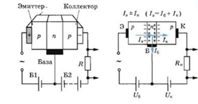 В кристалле образуются два р-n—перехода, прямые направления которых противоположны. Три вывода от областей с различными типами проводимости позволяют включать транзистор в схему, представленную на рисунке. В данной схеме левый р-n-переход является прямым и отделяет базу от области с проводимостью р-типа, называемую эмиттером. Батарея Б2 включена так, что правый р-n-переход в схеме является обратным. Он отделяет базу от правой области с проводимостью р-типа, называемой коллектором.