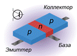 Рассмотрим один из видов транзисторов из германия или кремния с введенными в них донорными и акцепторными примесями. Распределение примесей таково, что создается очень тонкая прослойка полупроводника n-типа между двумя слоями полупроводника р-типа. Эту тонкую прослойку называют базой.