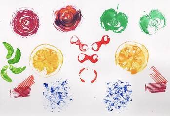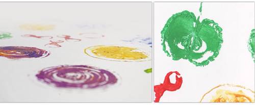 | На заметку: мокрые овощи и фрукты лучше промокать салфеткой, убирая лишнюю влагу перед нанесением на них краски. И, кстати, если использовать лимон и яблоко не сразу, а на следующий день после разрезания, то плод успевает подсохнуть и отпечатки получаются намного более фактурными. |