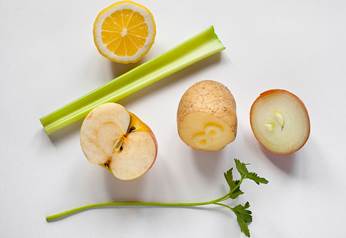 Овощи и фрукты – это не только вкусно и полезно, а еще и весело. Возьмите яблоко, разрежьте его на две части, окуните в краску и можно рисовать! На самом деле в ход могут идти любые фрукты, овощи, зелень. В нашем холодильнике нашлись: лимон, яблоко, сельдерей, петрушка, лук и картошка.