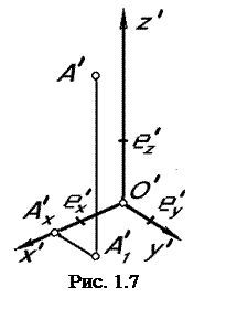 Для определения точки А на аксонометрической проекции недостаточно иметь только ее аксонометрическую проекциюA’.Нужно также иметь ее вторичную проекцию A’1, причем прямая A’1 A’должна быть параллельна аксонометрической оси z’ (рис. 1.7).