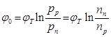 Равенству нулю тока через переход в отсутствие внешнего напряжения соответствует уменьшение диффузионной составляющей тока до величины его дрейфовой составляющей. Равенство составляющих тока Jдиф = Jдр создается установлением соответствующей величины потенциального барьера φ0 в р-п-переходе. Величина потенциального барьера φ0 (называемого также контактной разностью потенциалов) зависит от соотношения, концентраций носителей заряда одного знака по обе стороны перехода и определяется соотношением: