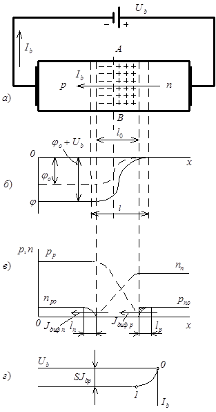 Рассмотрим распределение неравновесных концентраций носителей заряда в прилегающих к р-п-переходу слоях (рисунок 1.8, в), создаваемых диффузией носителей через смещенный в прямом направлении p-n-переход. Это важно для лучшего уяснения вида прямой ветви вольт-амперной характеристики перехода и представления общей картины протекания тока через переход в цепи с внешним источником.