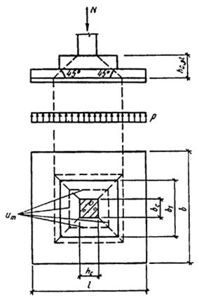 При определении величин um и F предполагается, что продавливание происходит по боковой поверхности пирамиды, меньшим основанием которой служит площадь действия продавливающей силы (площадь сечения колонны или подколонника), а боковые грани наклонены под углом 45° к горизонтали (черт. 9).