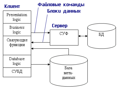 В этой модели файлы базы данных хранятся на сервере, клиент обращается к серверу с файловыми командами, а механизм управления всеми информационными ресурсами, собственно база мета-данных, находится на клиенте.