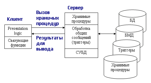 В данной модели сервер является активным, потому что не только клиент, но и сам сервер, используя механизм триггеров, может быть инициатором обработки данных в БД.