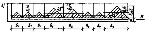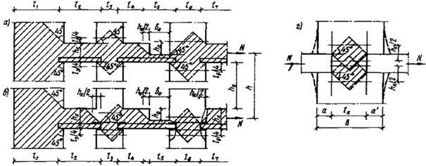 12. Расчетные площади сечения монолитной (без трещин) кладки Аk бетона Аb и арматуры Аs определяются в пределах рассматриваемого участка зоны влияния продольной силы N длиной l, возникающей в элементах стен и перекрытий при растяжении или сжатии, см. черт. 3 (заштриховано). Зона влияния силы N на длине li рассматриваемого участка имеет криволинейное очертание. Для упрощения расчетов криволинейное очертание зоны приближенно заменяется треугольным (пунктир) с углом в основании 45° и высотой, равной половине длины основания. Для каменных и бетонных конструкций, однородных по материалу или армированию, треугольное очертание зоны можно заменить равновеликим по площади прямоугольным (штрихпунктир). Высота или длина прямоугольной зоны определяется из равенства площадей прямоугольной и треугольной или трапецеидальной зон.