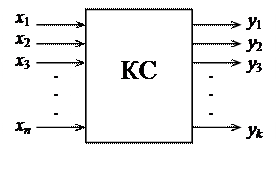 Комбинационную схему можно представить в виде п-k-полюсного элемента (рисунок 5.19). Входное двоичное слово (входной алфавит) комбинационной схемы задается набором символов хi (Х = {x1, x2, …, xп}), а выходное слово (выходной алфавит) принимает значения из выходных символов уj (Y = {y1, y2, …, yk}).