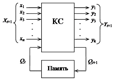 Конечным автоматом(последовательностным устройством, автоматом с памятью) называют логическое устройство, выходные сигналы которого (выходное слово Y) определяются не только действующей в данный момент времени ti комбинацией входных переменных (входным словом Х), но и внутренним состоянием устройства, которое явилось результатом воздействия на него входных слов в предыдущие такты (ti-1, ti-2 и т. д.).