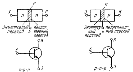Полупроводниковый кристалл транзистора состоит из трех областей с чередующимися типами электропроводности, между которыми находятся два р-п-перехода. Средняя область обычно выполняется очень тонкой (доли микрона), поэтому р-п-переходы близко расположены один от другого.