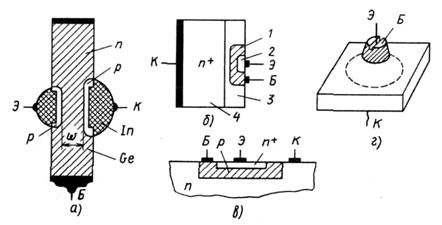 Технология изготовления биполярных транзисторов может быть различной: сплавление, диффузия, эпитаксия. Это в значительной мере определяет характеристики прибора. Типовые структуры биполярных транзисторов, изготовленных различными методами, приведены на рисунке 1.25. В частности, на рисунке 1.25, а показана структура сплавного, на рисунке 1.25, б – эпитаксиально-диффузионного, на рисунке 1.25, в – планарного, на рисунке 1.25, г – мезапланарноготранзисторов.