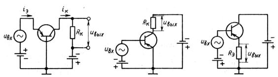 В этих схемах источники постоянного напряжения и резисторы обеспечивают режимы работы транзисторов по постоянному току, то есть необходимые значения напряжений и начальных токов. Входные сигналы переменного тока создаются источниками ивх. Они изменяют ток эмиттера (базы) транзистора, а, соответственно, и ток коллектора. Приращения тока коллектора (рисунок 1.26, а, б) и тока эмиттера (рисунок 1.26, в) создадут, соответственно, на резисторах RК и RЭ приращения напряжений, которые и являются выходными сигналами ивых.