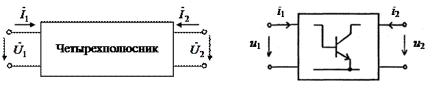 При определении переменных составляющих токов и напряжений (то есть при анализе электрических цепей на переменном токе) и при условии, что транзистор работает в активном режиме, его часто представляют в виде линейного четырехполюсника (рисунок 1.31, а). Названия (физическая сущность) входных и выходных токов и напряжений такого четырехполюсника зависят от схемы включения транзистора.