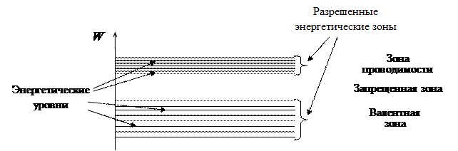 Совокупность энергетических уровней, на каждом из которых могут находиться электроны, называют разрешенной зоной (рисунок 1.1). Разрешенная зонахарактеризуется тем, что все ее энергетические уровни при температуре 0 К заполнены электронами. Совокупность энергетических уровней, соответствующих внешнему слою электронов, образует валентную зону. Разрешенные уровни энергии, которые остаются незанятыми электронами (при температуре, отличной от 0 К), составляют зону проводимости. Промежуток между валентной зоной и зоной проводимости называется запрещенной зоной.
