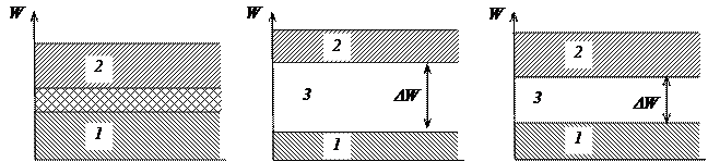 У диэлектриковширина запрещенной зоны 3 (рисунок 1.2, б) велика (DW > 6 эВ), электроны внешней оболочки достаточно жестко связаны с ядром и для перехода валентных электронов в зону проводимости нужно сообщить им значительную энергию. Так, например, при высокой напряженности внешнего электрического поля может произойти отрыв валентных электронов и их лавинное размножение, которое называется пробоем диэлектрика. В результате пробоя диэлектрик теряет свои свойства и становится проводником.