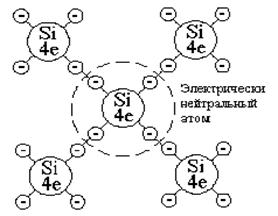 В абсолютно чистом полупроводнике при температуре, близкой к абсолютному нулю, и отсутствии внешнего электрического поля все валентные электроны участвуют в ковалентных связях. При этом переход любого электрона от одного атома к другому сопровождается встречным переходом электрона от другого атома. Свободные носители зарядов отсутствуют, поэтому электропроводность полупроводника при таких условиях равна нулю, его свойства близки к свойствам диэлектрика.