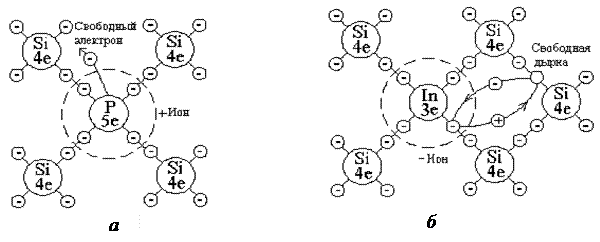 донорной (а) и акцепторной (б) примесью