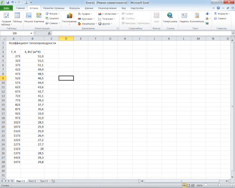 Создаем новый документ Microsoft Office Excel и в нем в виде таблицы указываем в одном столбце значения температуры (в К), а в другом столбце соответствующие этим температурам значения коэффициента теплопроводности (в Вт/(м·К)) (табл. 2.1, рис. 2.1).