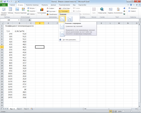 Далее необходимо получить графическую зависимость коэффициента теплопроводности от температуры в виде точечного графика. Для этого во вкладке Вставка в меню Диаграммы выбираем Точечнаясмаркерами (рис. 2.2).