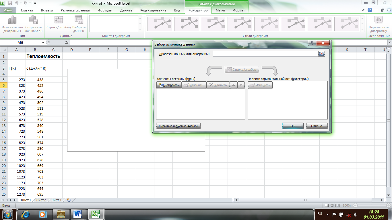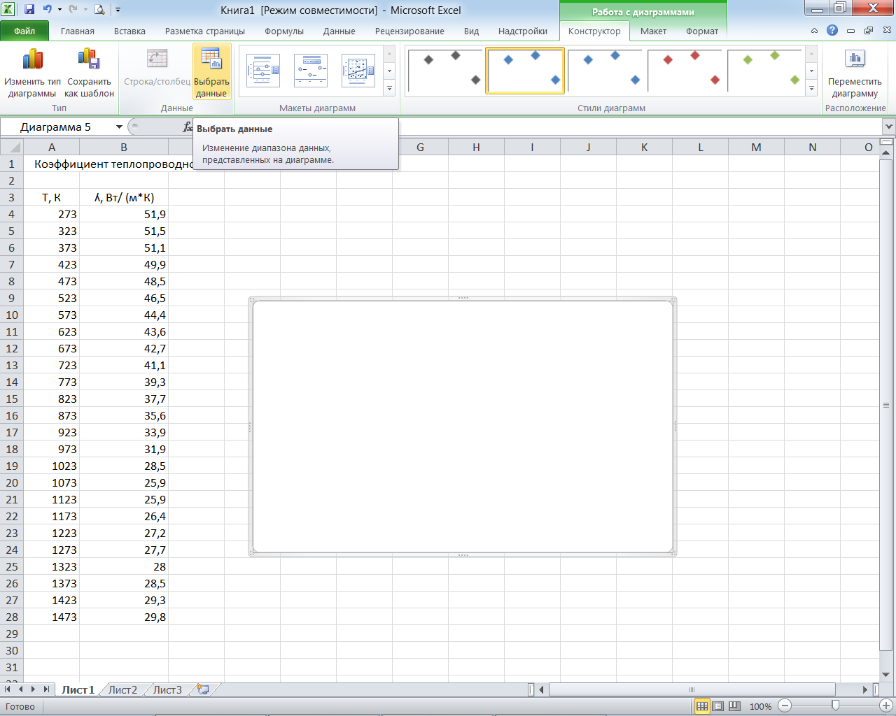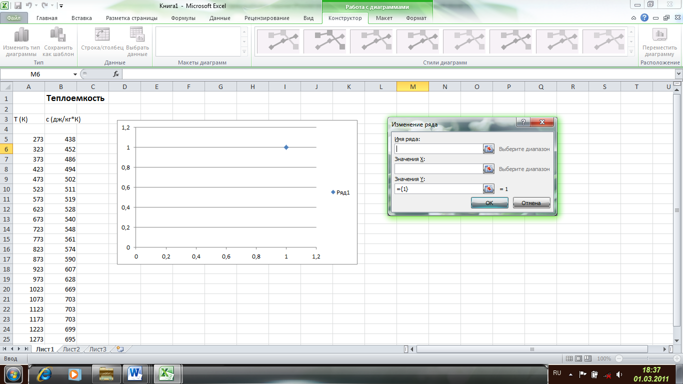 В качестве имени ряда пишем название графика «Зависимость коэффициента теплопроводности от температуры», в качестве значений Х выделяем все значения температуры, а в качестве значений Y все значения коэффициента теплопроводности (предварительно удалив содержимое строки, заданное автоматически). Нажимаем ОК в окнах Изменение ряда и Выбор источника данных.