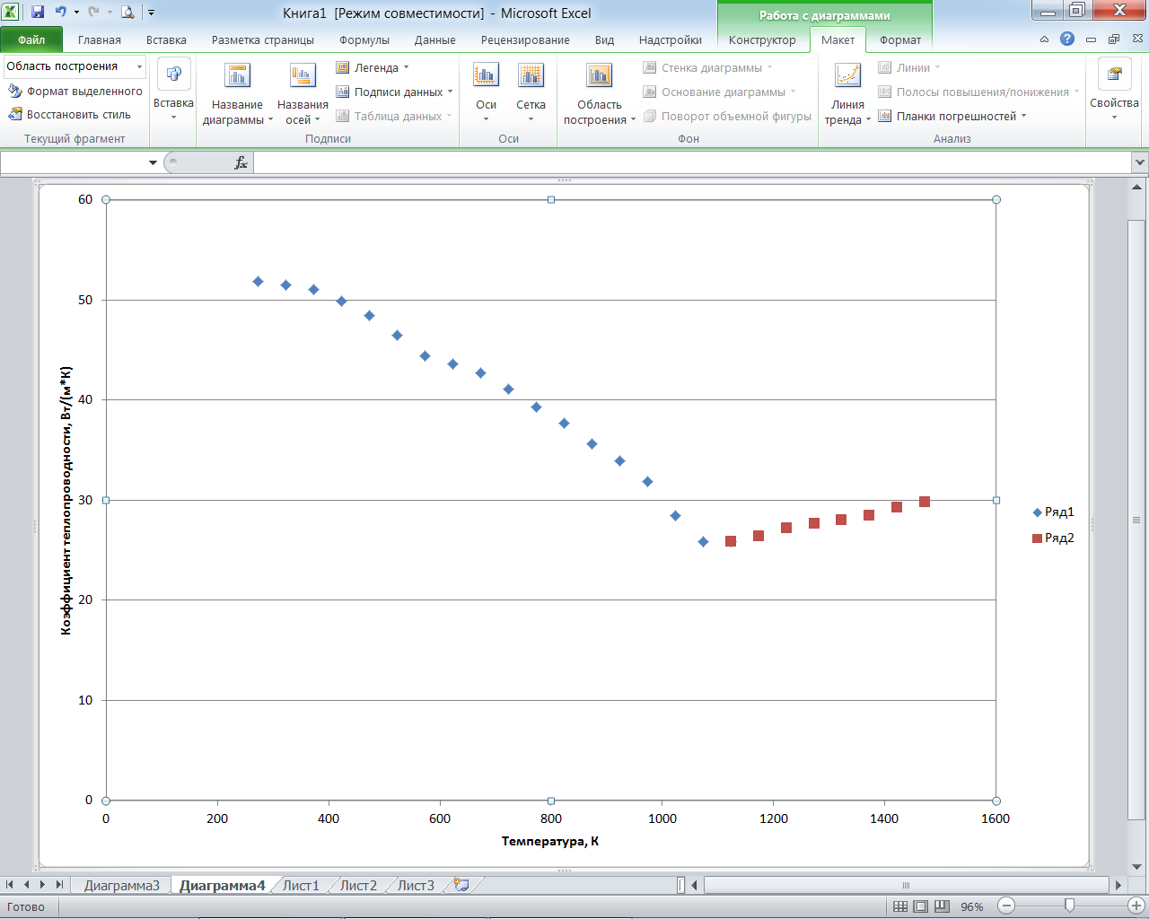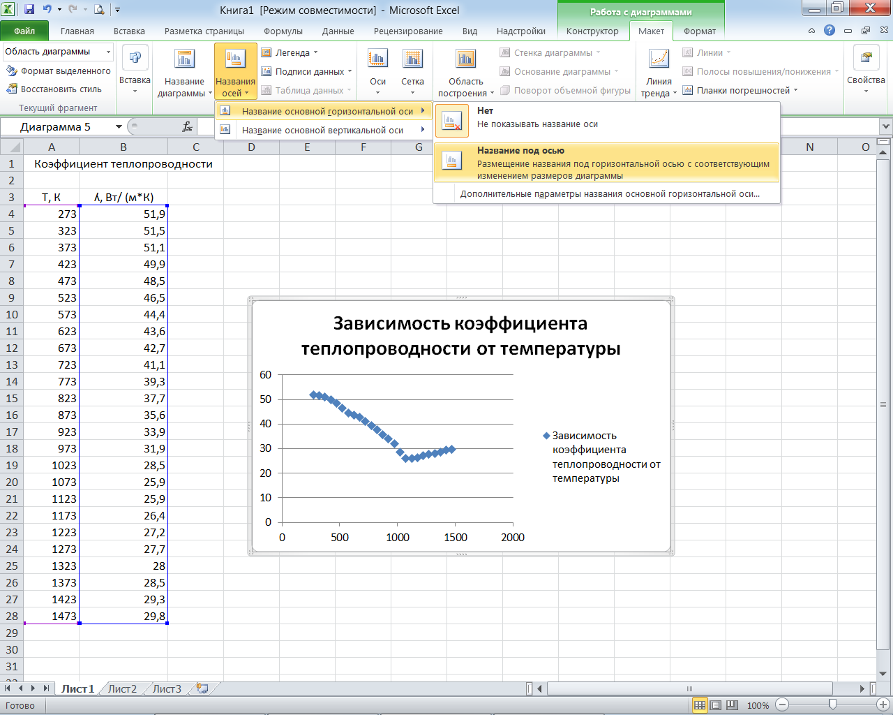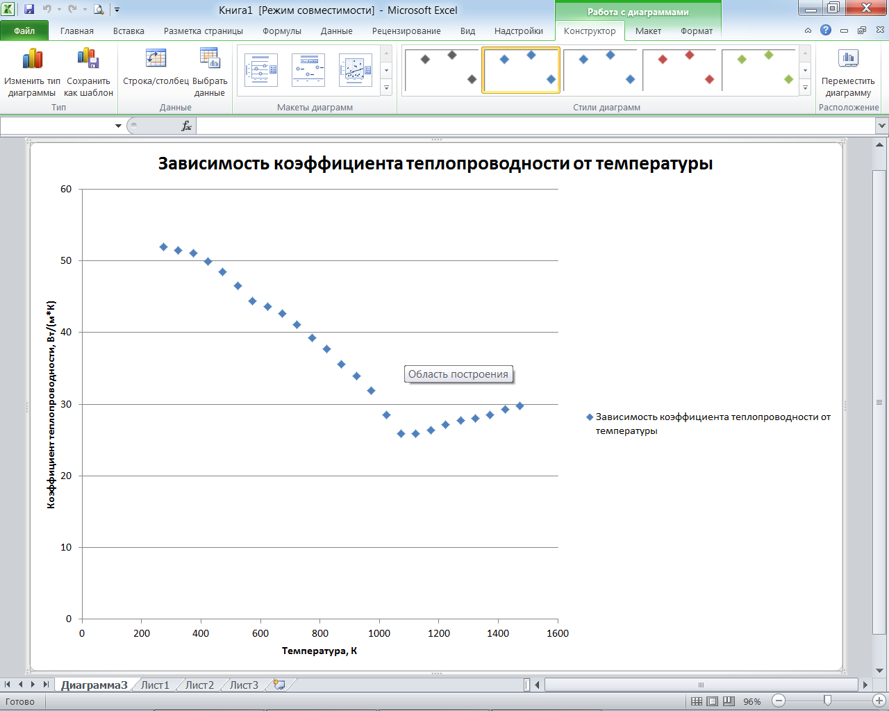 Затем перемещаем диграмму на отдельный лист нажав Конструктор > Переместить диграмму > На отдельном дисте.В результате получаем точечную диаграмму зависимости коэффициента теплопроводности от температуры (рис. 2.7).